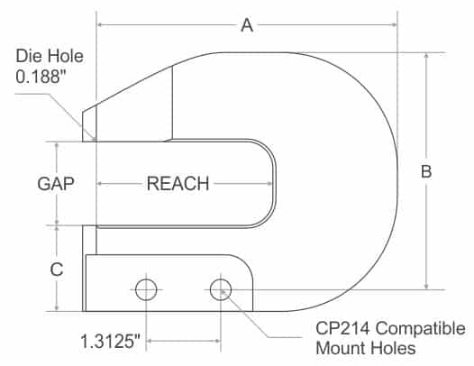 *All C-Squeezers accept industry standard CP-214 yokes. *All Squeezers accept rivet dies with 3/16″ (0.187″) shanks.